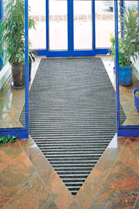 Данный тип решеток предназначен для помещений с высокой и средней проходимостью (аэропорты, вокзалы, торговые центры, больницы, банки, гостиницы, офис-центры и т.д.) Принцип действия решетки основан на том, что в тот момент, когда человек отрывает ногу от пола, он непроизвольно отводит ее немного назад, и за счет трения подошвы о резиновые полосы частицы грязи соскребаются и попадают в ячейки. Скопившуюся грязь убирают, приподняв конструкцию и свернув ее в рулон. Решетки устойчивы к коррозии и перепадам температуры от -40°С до +70°С. Решетка может быть изготовлена любого размера и установлена в специально подготовленное углубление, либо на поверхность пола, в наружном алюминиевом обрамлении.
