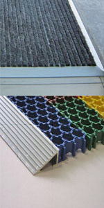 Наиболее полно этому перечню соответствуют придверные решетки на основе алюминиевого профиля. Конструкция состоит из алюминиевых ламелей, соединенных тросами из нержавеющей стали. В ламели вставляются полосы различных компонентов: резина, текстиль (черный, коричневый или синий цвет), узкая или широкая щетка и скребок, каждый из которых предназначен для выполнения особых задач. Так резина в комбинации со скребком, узкой или широкой щеткой обычно устанавливается на улице, перед входом в помещение. Текстиль в разных комбинациях используется внутри помещения (тамбуры, холлы и т.д.)