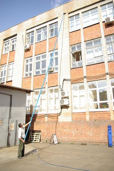 Мы используем сверхлегкие углепластиковые штанги и деминерализованную воду. Это оборудование не повреждает фасадные покрытия во время работы, прекрасно очищая поверхность от естественных загрязнений (сажа, грязь, пыль и т.д.). Тем самым мы не тратим Ваши средства на подъем наших специалистов на высоту при помощи подъемников или снаряжения альпинистов.
